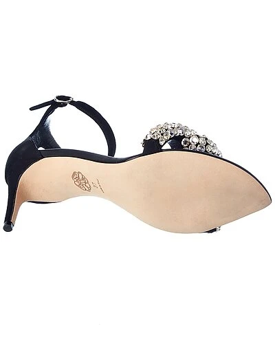 - Crystal Embellished Suede Sandal in black suede and leather and silver-tone hardware with crystal embellishments