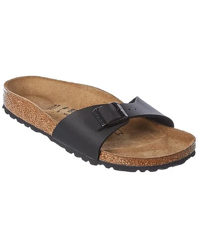 - Madrid Birko-Flor Sandal in black birko-flor and black hardware with buckle accent