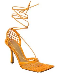 - Stretch Ankle Wrap Leather Sandal in orange leather with mesh detail