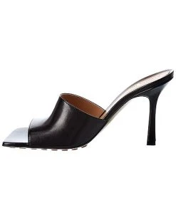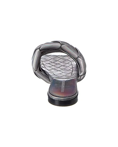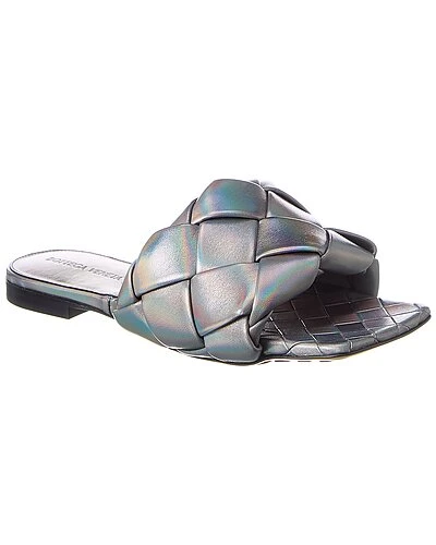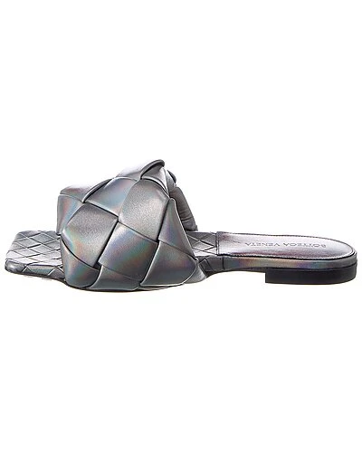 - The Lido Intrecciato Leather Sandal in oyster metallic intrecciato leather with squared sole