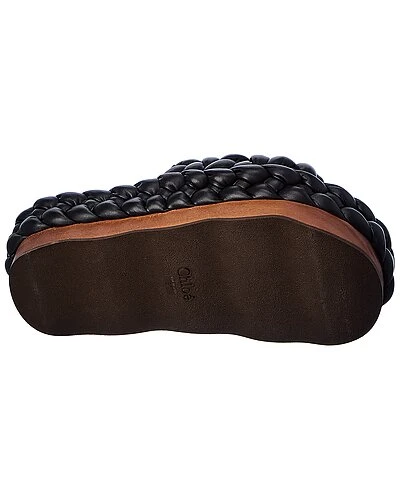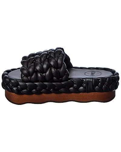 - Wavy Leather Platform Sandal in black woven leather with scalloped wooden platform sole