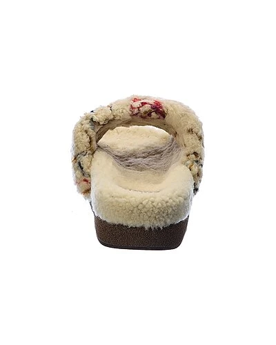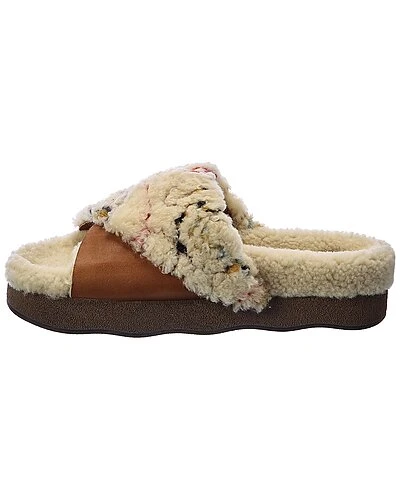 - Wavy Shearling & Leather Slide in white multicolor shearling and brown leather with crossover straps