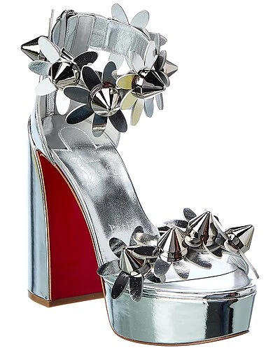 - Daisy Spikes Alta 130 Leather Platform Sandal in silver leather and silver-tone hardware with floral appliques and spike embellishments