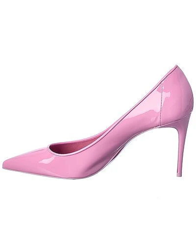 - Sporty Kate 85 Patent Pump in pink patent leather and silver-tone hardware with logo accent and pointy-toe