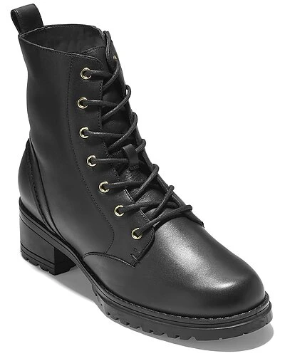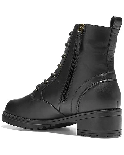 - Camea Waterproof Leather Combat Boot in black leather and light gold-tone hardware
