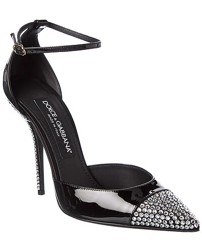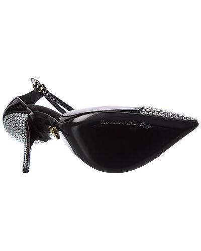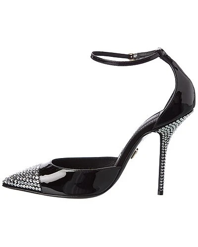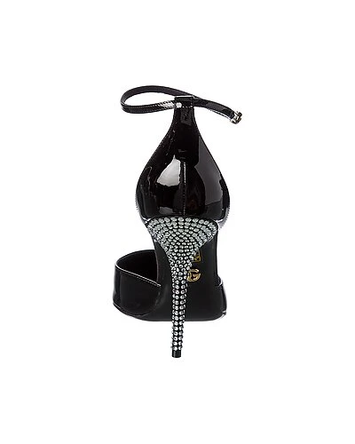 - Fusible Patent Pump in black patent leather and satin and gold-tone hardware with crystal embellishments