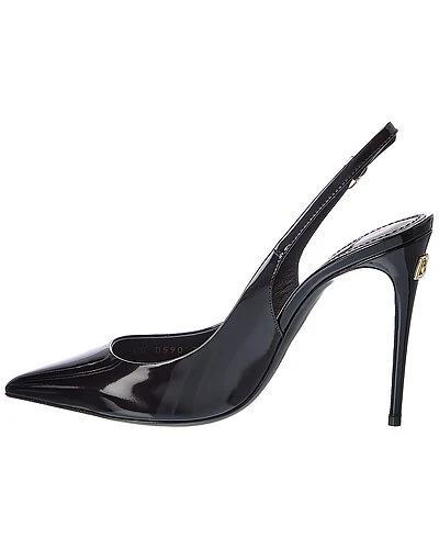 - Logo Patent Slingback Pump in black patent leather and gold-tone hardware with pointy-toe