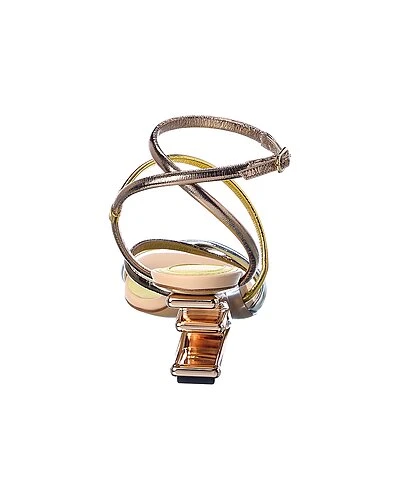 - First Leather Sandal in gold and silver leather and gold-tone hardware with logo heel