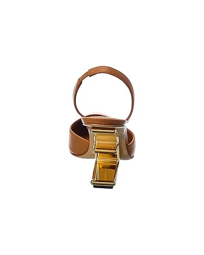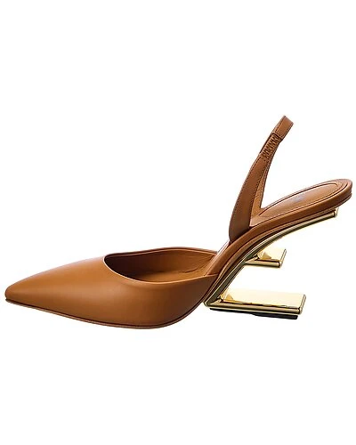- First Leather Slingback Pump in brown leather and gold-tone hardware with logo heel