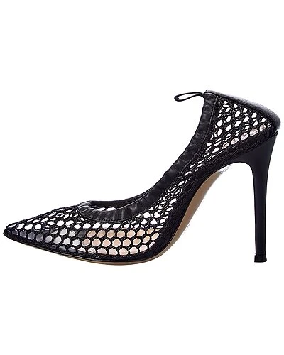 - Alisia 105 Mesh & Leather Pump in black fishnet mesh and leather with elasticized back, pointy-toe with transparent vinyl lining