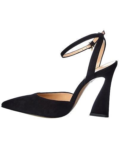 - Aura D’Orsay 105 Suede Pump in black suede and gold-tone hardware with pointy-toe