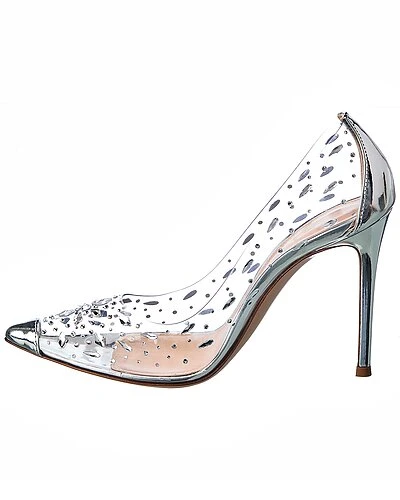 - Halley 105 Plexi & Leather Pump in silver leather and transparent vinyl with crystal embellishments and pointy-toe