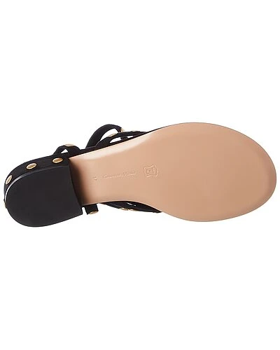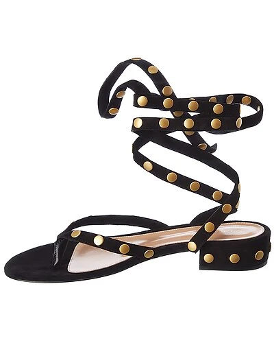 - Suede Ankle Wrap Sandal in black suede and gold-tone hardware with studded design