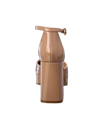 - Vian 70 Patent Platform Pump in soft peach patent leather and gold-tone hardware with logo buckle