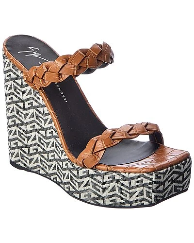 - Zanilla 90 Croc-Embossed Leather Wedge Sandal in brown croc-embossed leather with braided straps and logo canvas wedge
