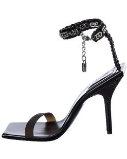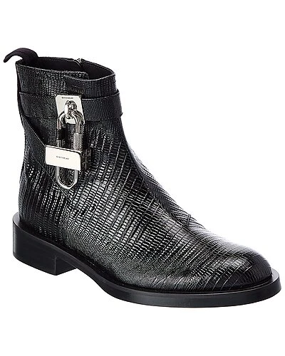 - Lock Croc-Embossed Leather Bootie in black croc-embossed leather and silver-tone hardware with padlock accent and pull-on tab