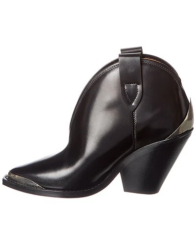 - Amille Leather Bootie in black leather and silver-tone hardware with metal accents and pointy-toe