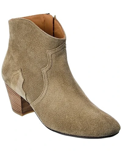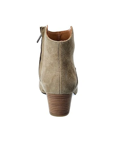 - Dicker Suede Bootie in taupe suede and gold-tone hardware with western style stitching