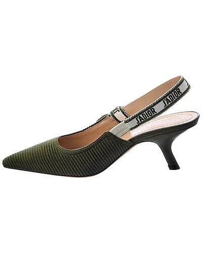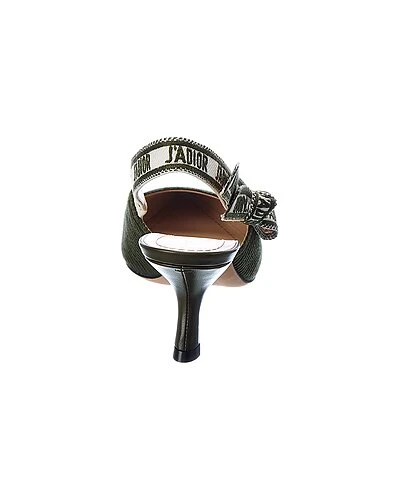 - J’Adior Canvas & Leather Slingback Pump in khaki textured canvas and leather with logo printed elasticized slingback strap with bow accent