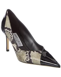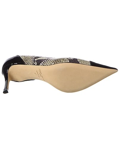 - Cass 75 Snake-Embossed Leather & Patent Pump in black patent and snake-embossed leather with pointy-toe