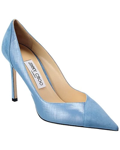 - Cass 95 Suede & Leather Pump in smoky blue suede and etched patent leather with pointy-toe