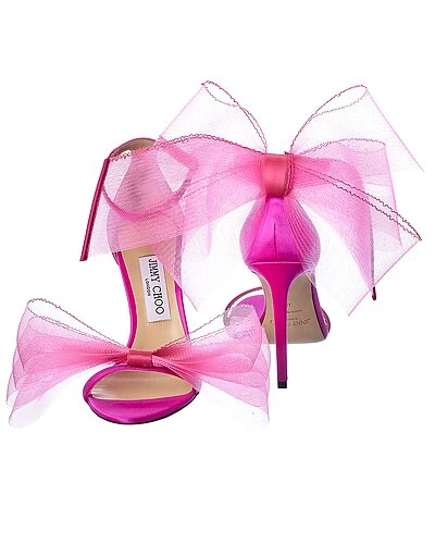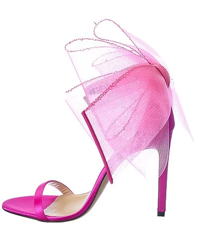 - Aveline 100 Satin Sandal in fuchsia satin and gold-tone hardware with oversized mesh bows