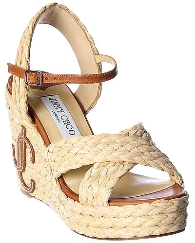 - Dellena 100 Raffia & Leather Wedge Sandal in natural raffia and brown leather and gold-tone hardware with logo accent