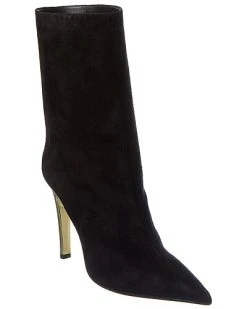 - Cierra 100 Suede Bootie in black suede and gold-tone hardware with pointy-toe