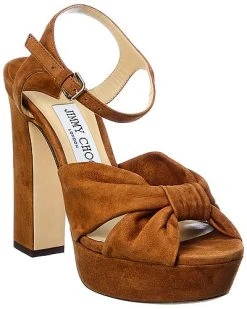 - Heloise 120 Suede Platform Sandal in tan suede and gold-tone hardware with knot accent