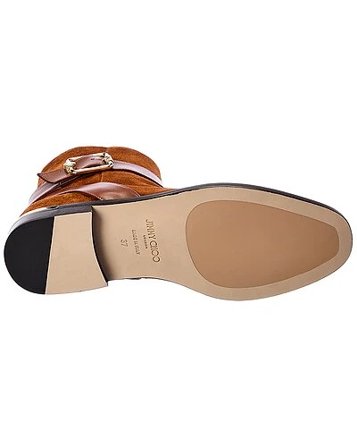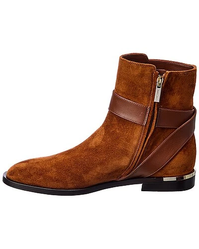 - Clarice Suede Bootie in dark tan suede and gold-tone hardware with logo buckle