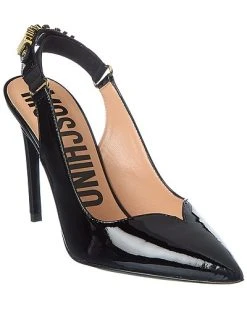 - Design details: gold-tone hardware, elasticized slingback strap with logo lettering