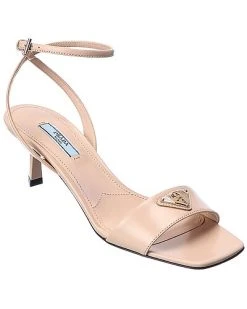 - Leather Sandal in beige leather and steel-finish hardware with triangle logo accent