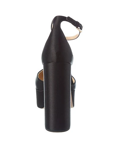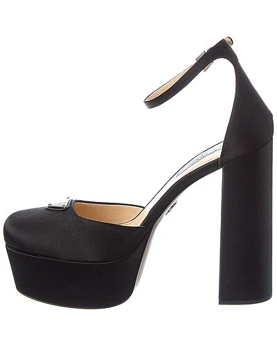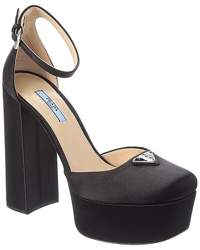 - Logo Satin Platform Pump in black satin and steel finish hardware with triangle logo