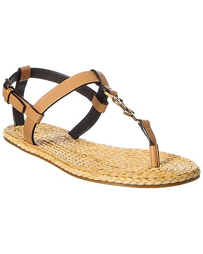 - Cassandra Leather Sandal in brown leather and gold-tone hardware with monogram accent