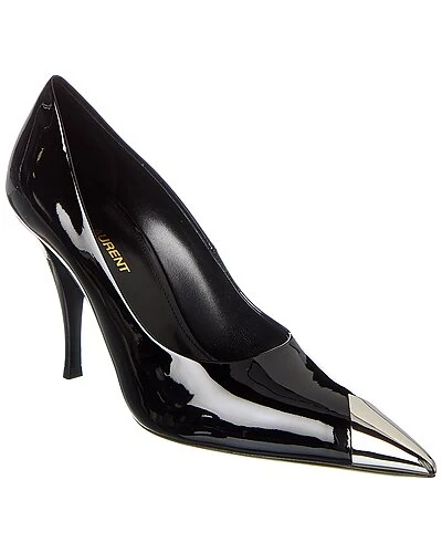 - Maike 90 Patent Pump in black patent leather and silver-tone hardware with pointy-toe