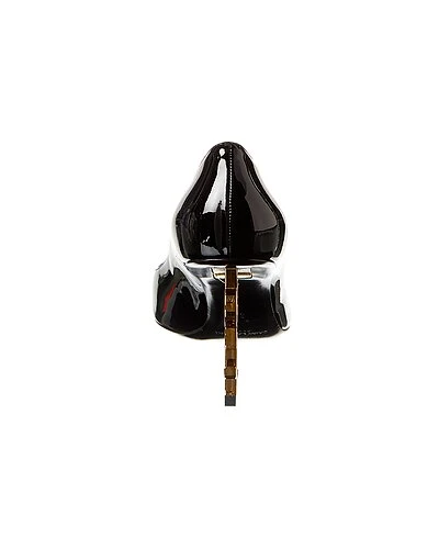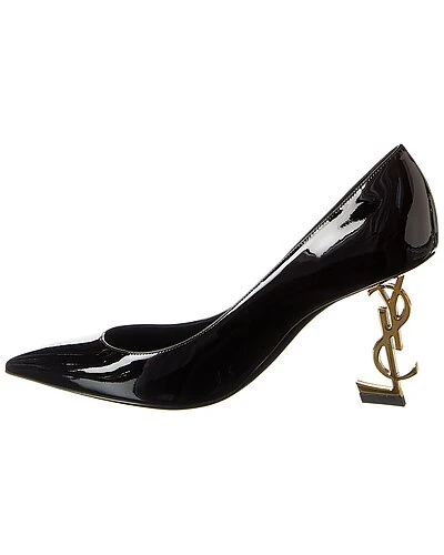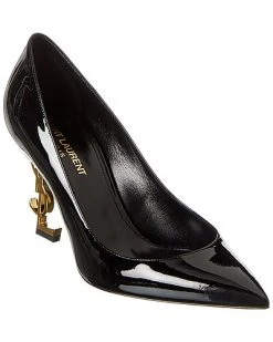 - Opyum 85 Patent Pump in black patent leather and gold-tone hardware with logo heel
