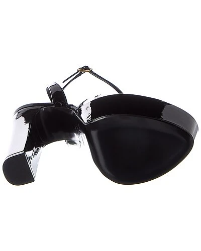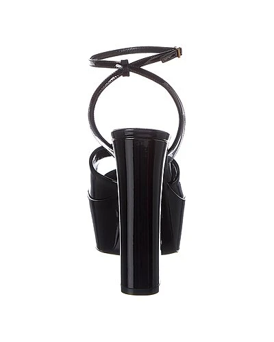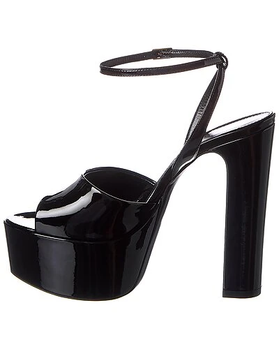 - Sexy 95 Patent Platform Sandal in black patent leather and gold-tone hardware with peep toe