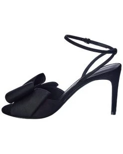 - Lascari Satin & Suede Sandal in black satin and suede and silver-tone hardware with rhinestone embellishments