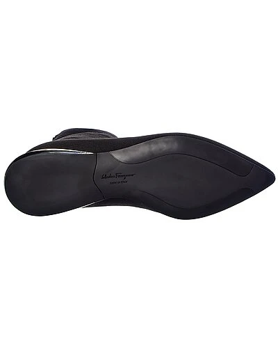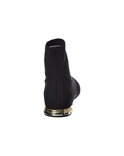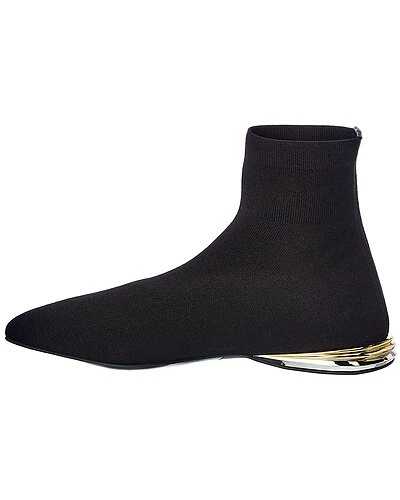 - Missy Knit Sock Bootie in black knit textile and gold-tone hardware with logo accent, metallic sole and pointy-toe
