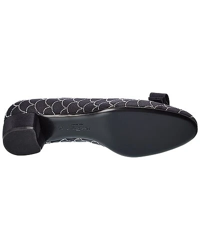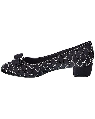 - Vara Bow Satin Pump in black satin and silver-tone hardware with rhinestone detailing
