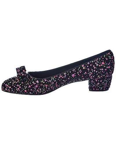 - Vara Suede Pump in black suede and silver-tone hardware with multicolor splatter design and suede Vara bow accent