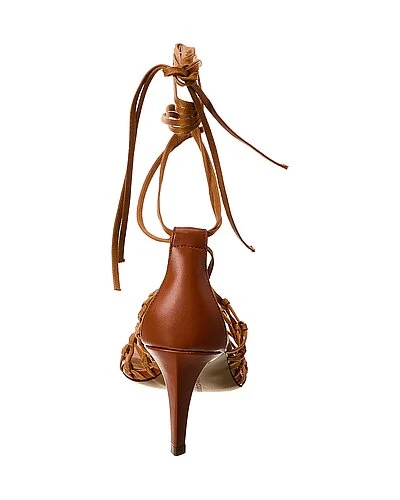 - Ankle Wrap Sandal in caramel textile and vegan-friendly faux leather with macrame design