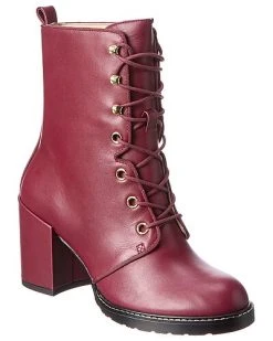 - Cassey Leather Bootie in cranberry leather and gold-tone hardware with grosgrain trim
