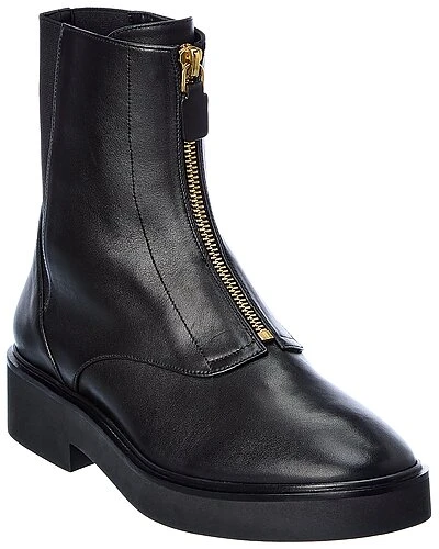 - Lodge Zip Leather Bootie in black leather and gold-tone hardware with elasticized paneling