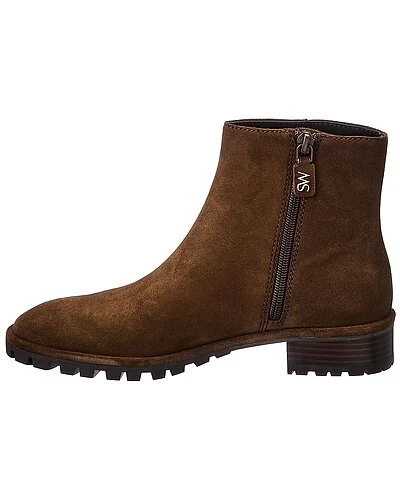 - Maelie Suede Bootie in walnut suede and gold-tone hardware with logo accent at zipper pull