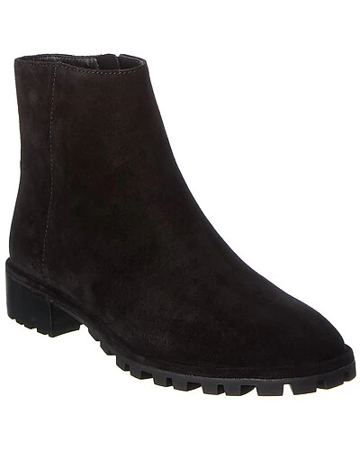 - Maelie Suede Bootie in black suede and gold-tone hardware with logo accent at zipper pull