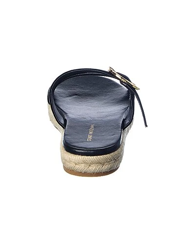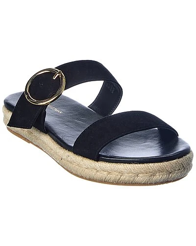 - Mykonos Two Strap Suede Sandal in black suede and gold-tone hardware with round buckle and jute platform