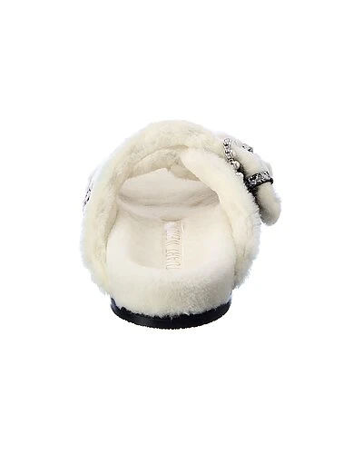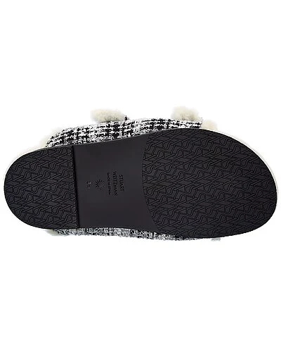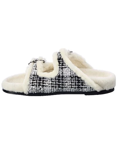 - Piper Chill Tweed & Shearling Slide in flannel plaid tweed and white shearling and silver-tone hardware with pearl-embellished buckle accents