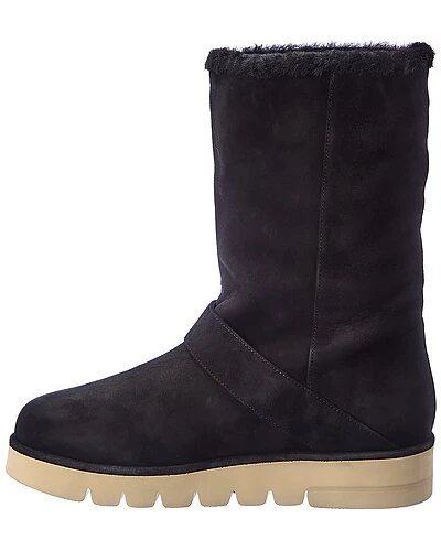 - Piper Lift Chill Suede & Shearling Bootie in black suede and shearling and gold-tone hardware with pearl buckle