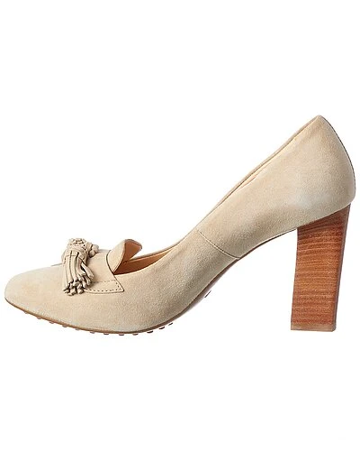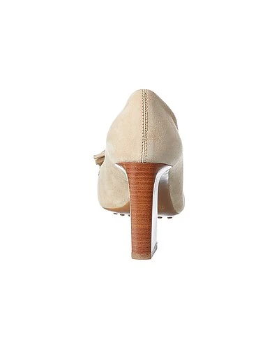 - Tasseled Suede Pump in beige suede with tassel accents